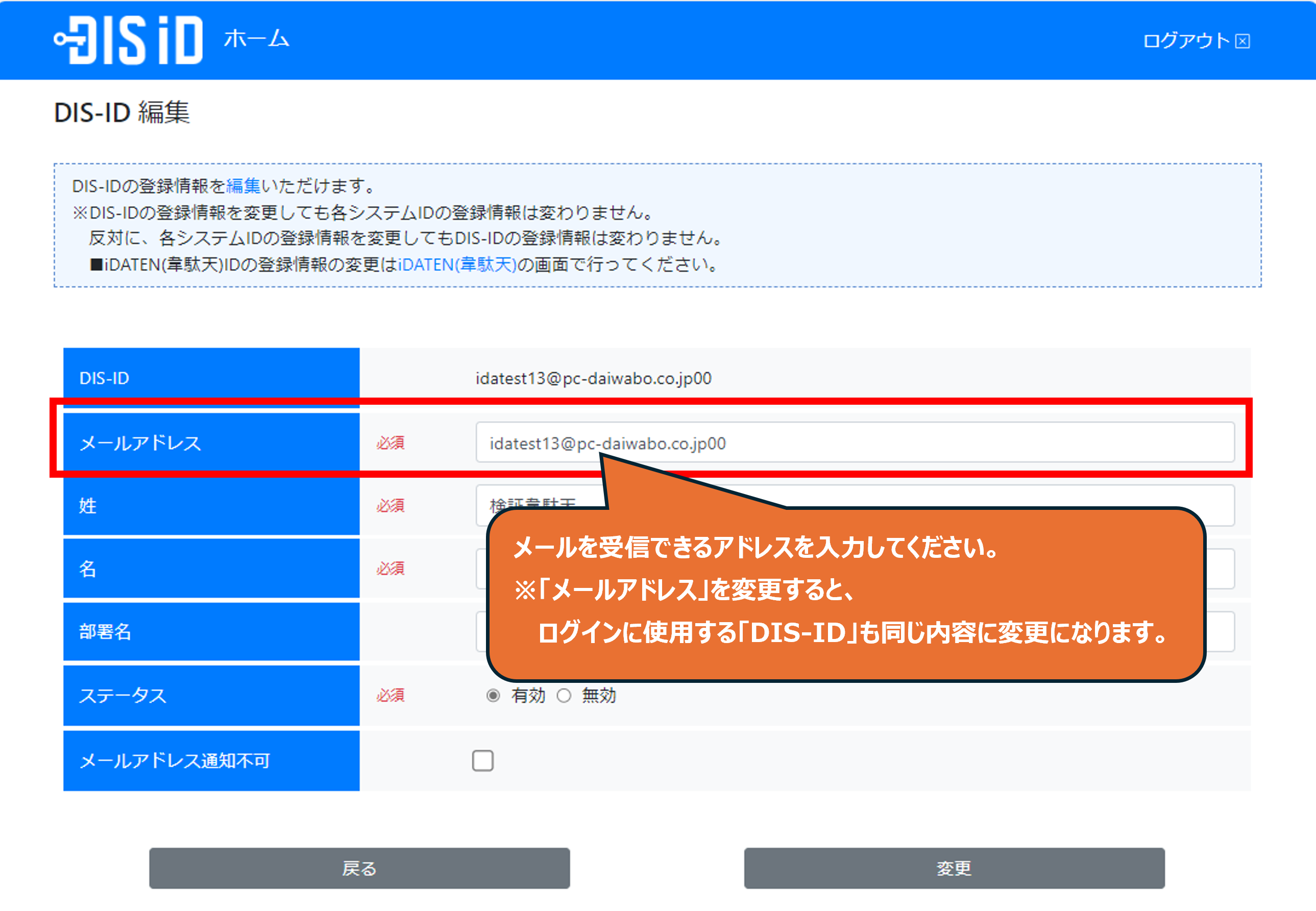※「メールアドレス」を変更すると、ログイン時に入力する「DIS-ID」も変更になります。