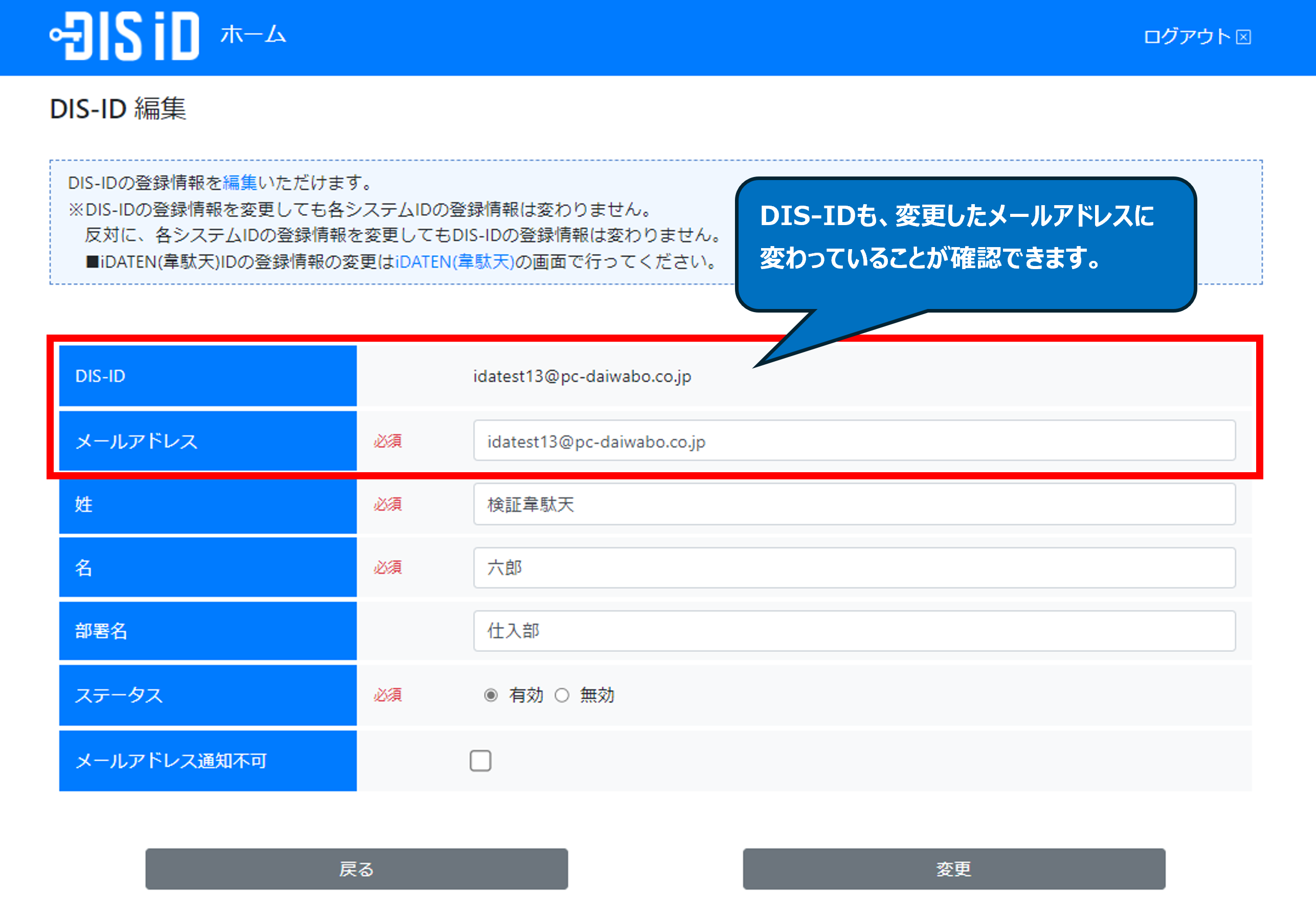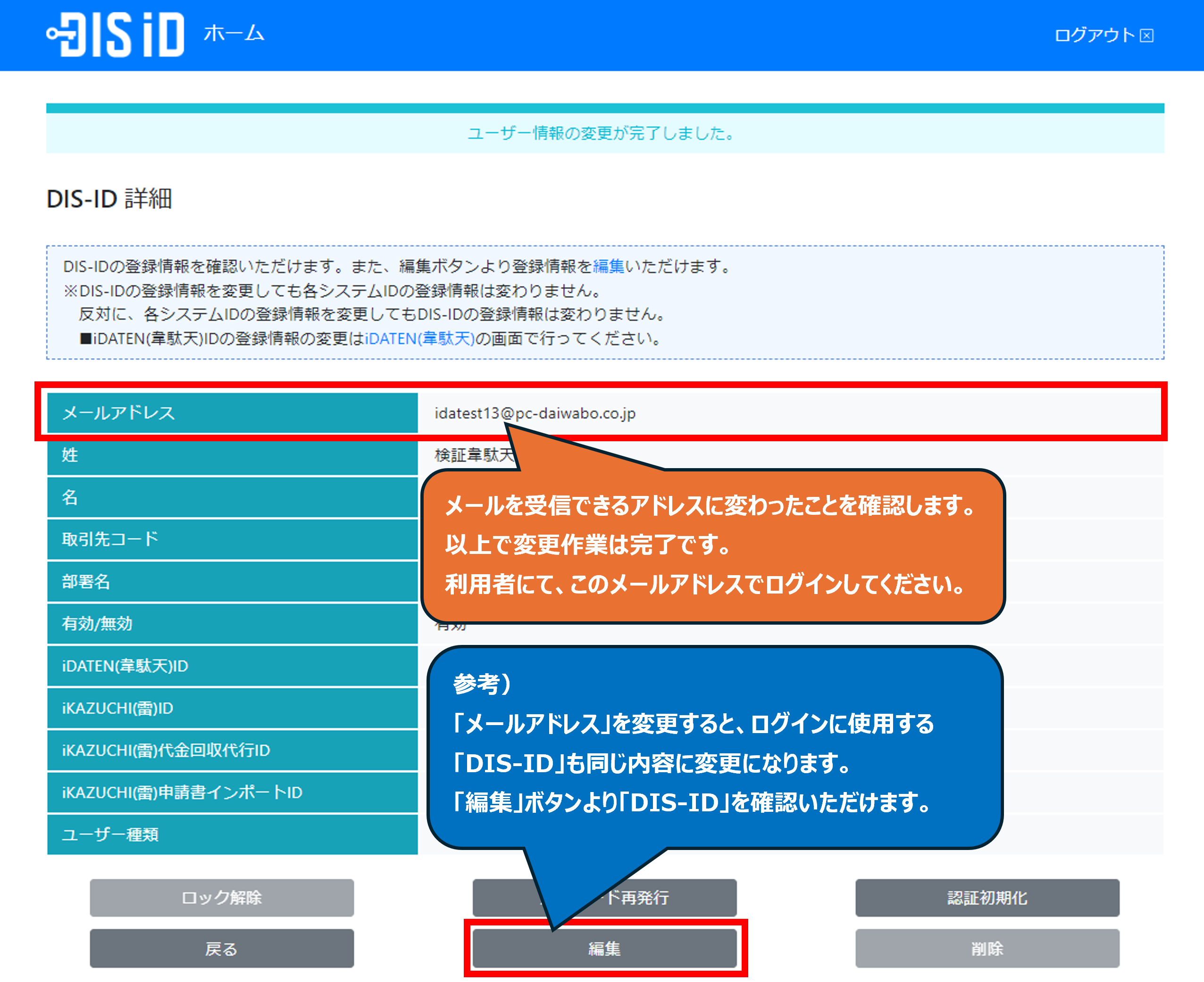7.DIS-IDも、変更したメールアドレスに変わっていることが確認できます。