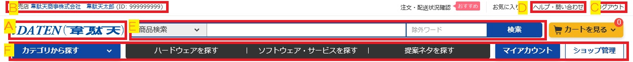 B:ログイン中IDの情報表示 C:ログアウト D:ヘルプ/問い合わせ先 E:フリーワード検索 F:操作メニュー
