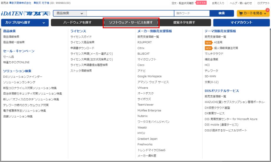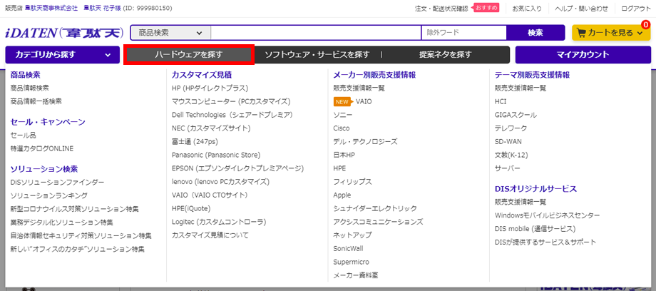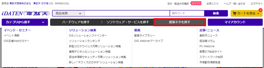 ・「ハードウェアを探す」「ソフトウェア・サービスを探す」「提案ネタを探す」と「マイアカウント」に分かれています。