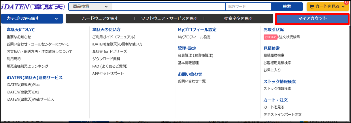 ・「マイアカウント」では、注文状況確認、見積履歴検索やMyプロフィール設定などの選択ができます。