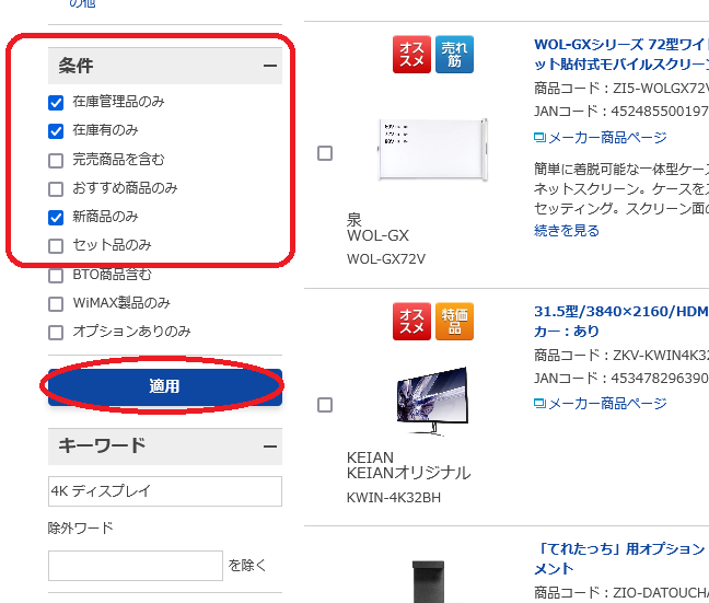 ・さらに検索結果を絞り込む場合は、商品条件などを指定した後で「適用」ボタンをクリックします。