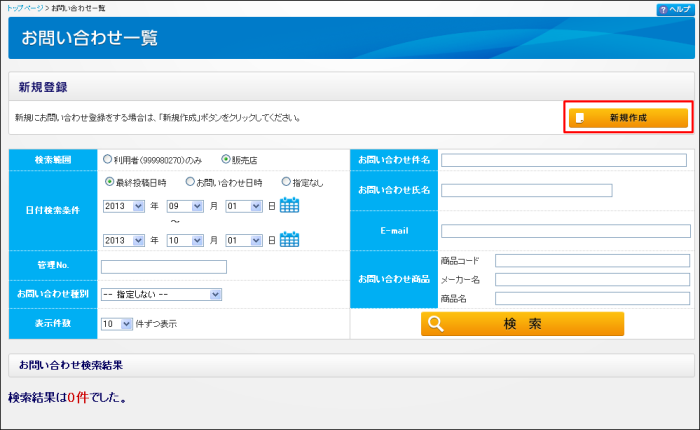 お問い合わせを登録する場合は、右上の「新規作成」ボタンをクリックします。