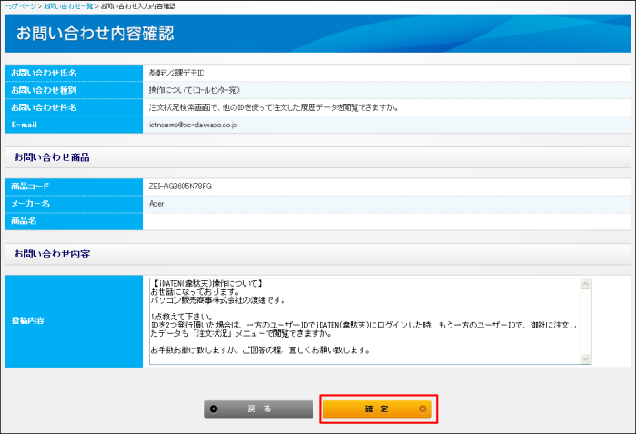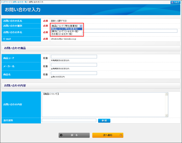 ・商品について … 弊社営業担当者 宛にメール送信を行います。