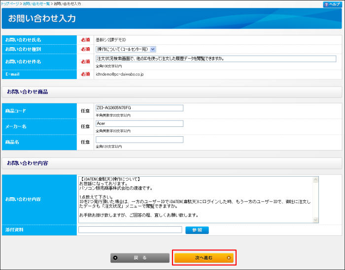 お問い合わせフォームを使うことで、メールソフトを使わなくても、弊社営業担当やiDATEN(韋駄天)コールセンター宛に、問い合わせや要望などを送信したり履歴管理する事ができます。
