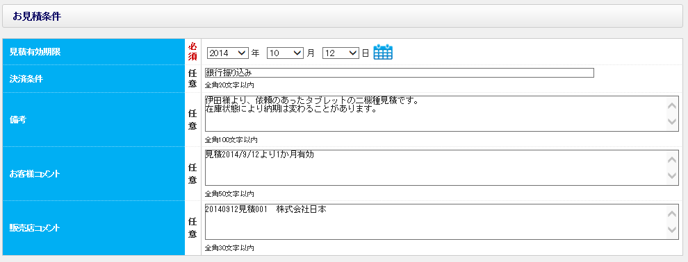 ・販売店コメント(任意:全角30文字以内)…お客様用見積検索一覧画面と詳細画面に表示されます。見積書には表示されません。