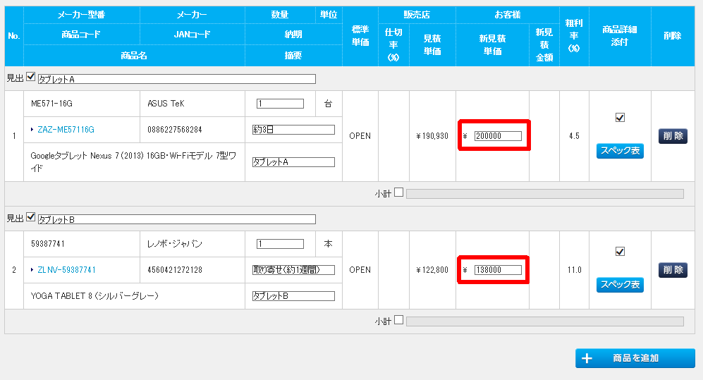 ・摘要(任意入力:全角15文字以内)…商品に対するコメントなどを自由入力します。見積書に表示されます。