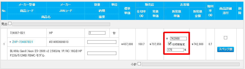 ※標準価格が設定されている商品では、新見積単価を仕切率の%で指定することも可能です。