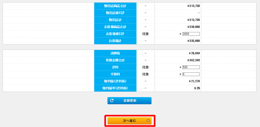 5・お客様値引き、送料、手数料の入力を行い、「金額更新」ボタンをクリックすると粗利益などの金額が計算されます。