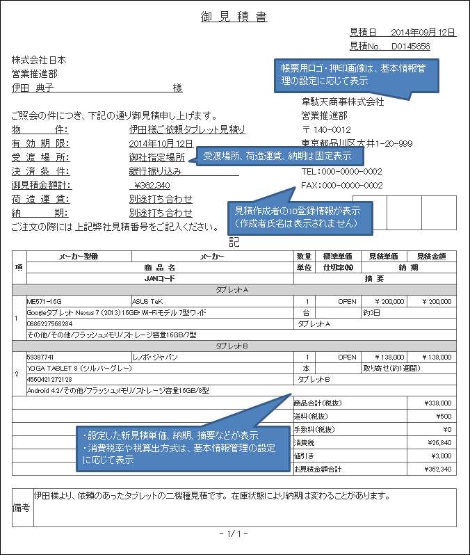 ※見積書右上の会社名・住所・部署名・電話・FAX番号は、見積作成者のID登録情報が表示されます。