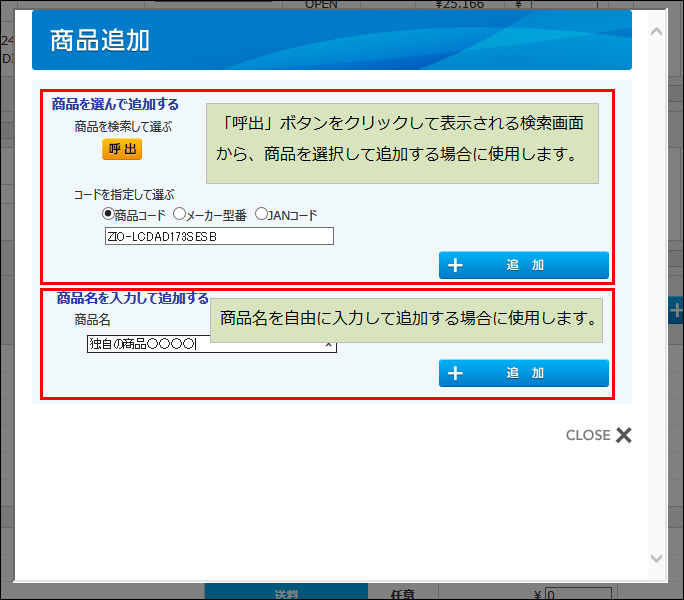上部の「商品を選んで追加する」では、呼出ボタンをクリックして表示される商品検索画面から、商品を選択して追加ができます。