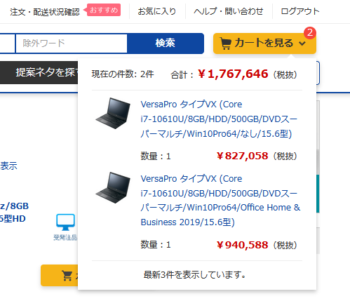1・商品検索結果などの画面より、「カートに入れる」ボタンをクリックして、商品をカートに入れます。