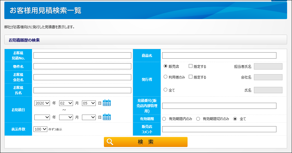 お客様見積No.、見積の発行日、発行者の区分などを指定して、「検索」ボタンをクリックします。