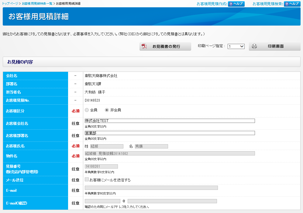 お客様用見積書の印刷、PDF発行、見積書を編集して更新が可能です。