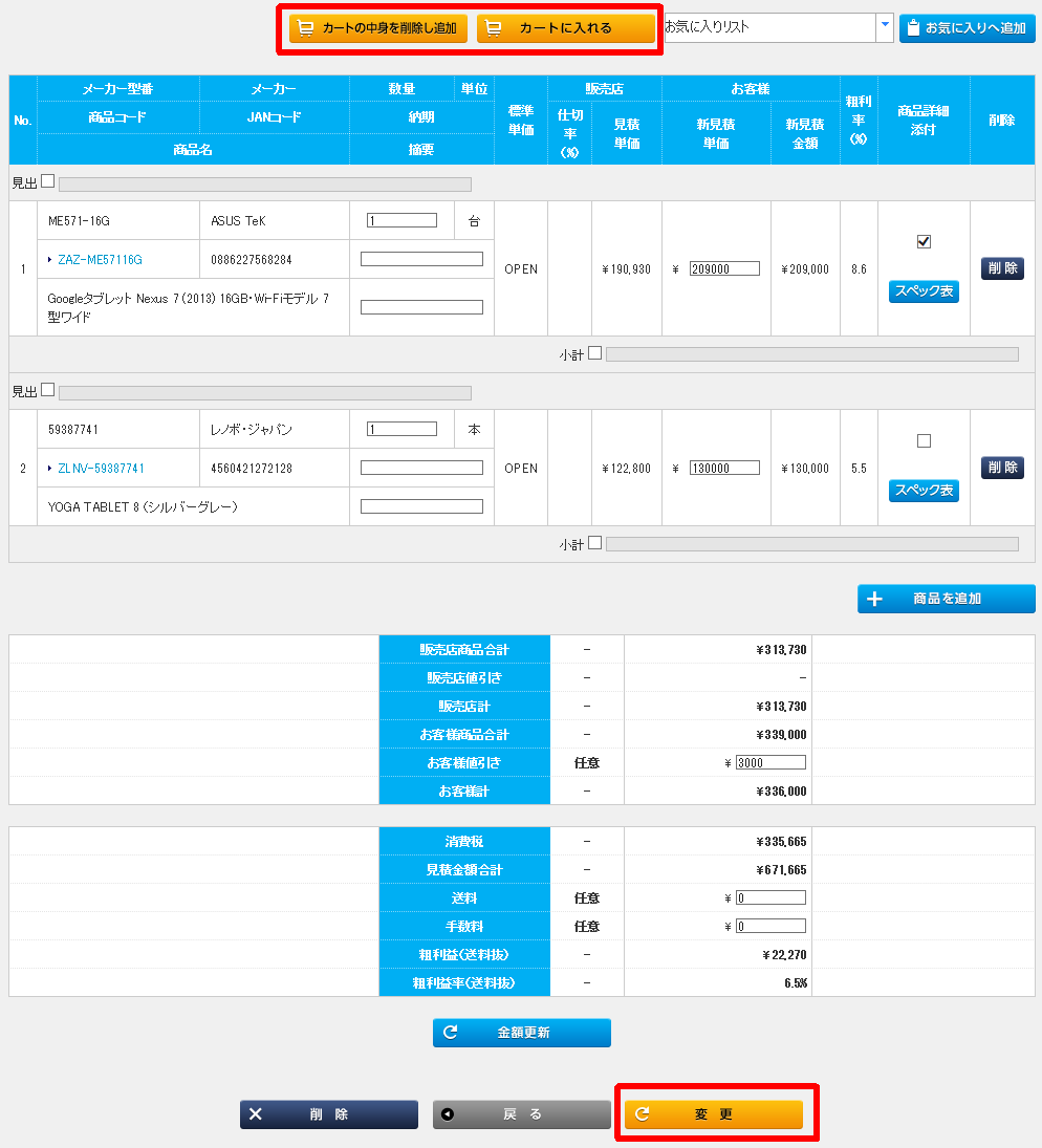 ※お客様見積の修正を行った場合は、「変更」ボタンをクリックしてください。見積が更新されます。