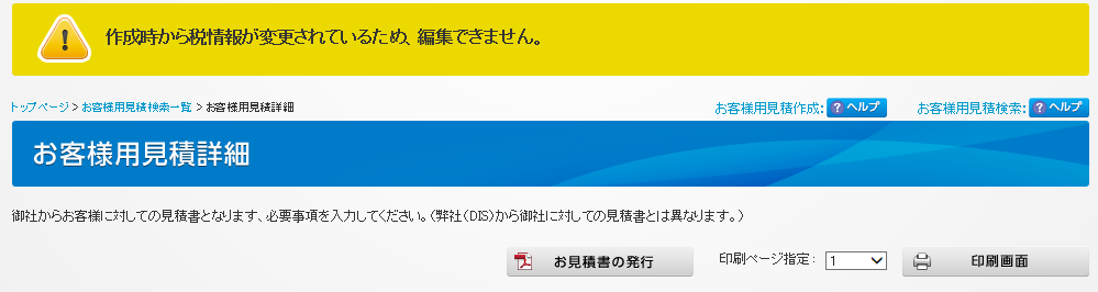 ※見積書の編集更新が出来ない場合は、右画像のような警告が表示されます。