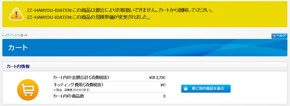 ※カートに入れた商品に問題がある場合は、右画像のような警告が表示されます。