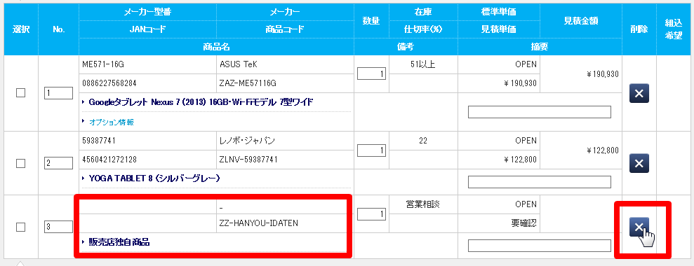 お客様用見積の内容修正や、見積書の商品をカートに入れる場合も、この画面から行います。
