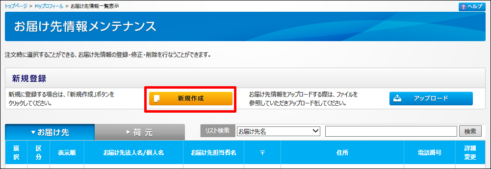 「お届け先」のタブが選択されている事を確認してから、新規作成ボタンをクリックします。