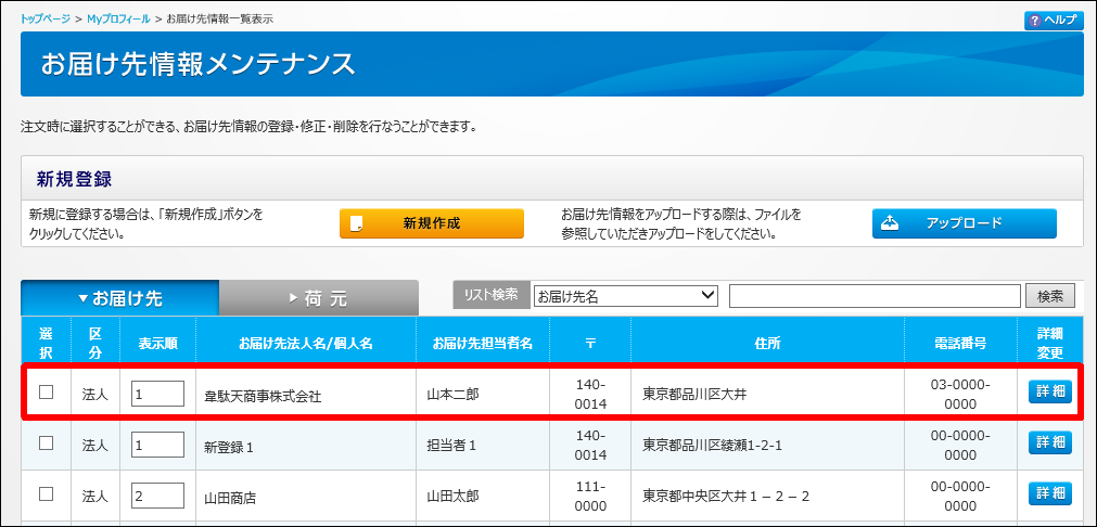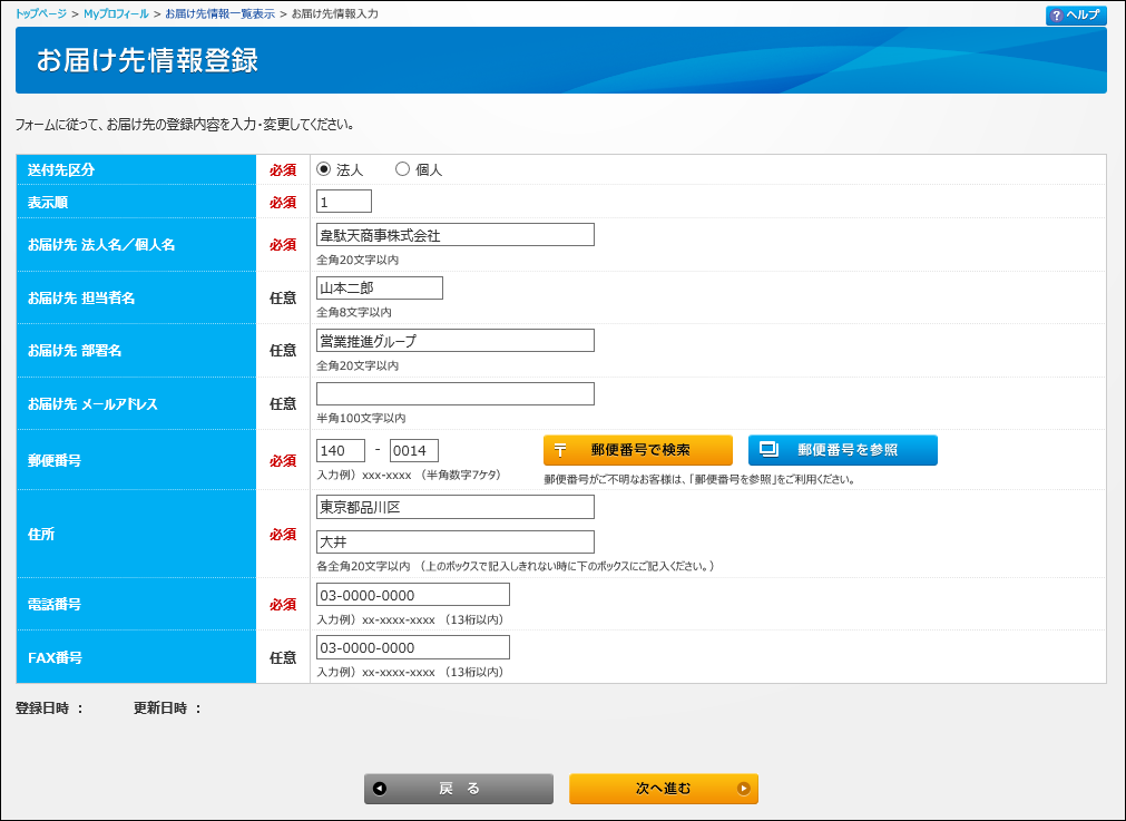 (注文入力画面から追加登録されたお届け先は「法人」として登録されます。)