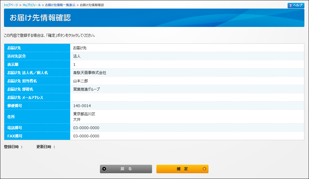 5・お届け先情報登録確認の画面が表示されます。入力内容を確認したら、「確定」ボタンをクリックします。