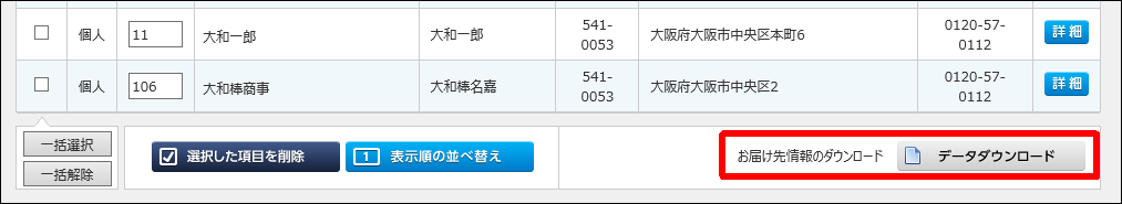 1・お届け先の一覧画面の下部より、お届け先情報のダウンロードの「データダウンロード」ボタンをクリックします。