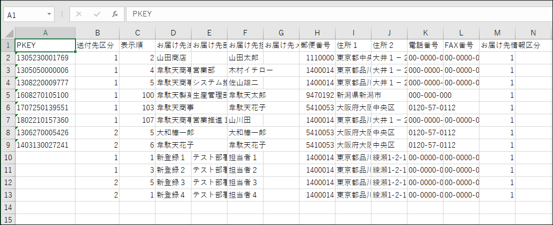 別のIDで登録されたお届け先情報のデータ流用してアップロードする場合は、新規登録扱いとなりますので、A列のPKEYは空欄にしてください。