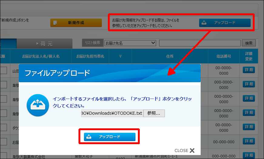 お届け先情報のダウンロードとアップロード機能を使用すると、新規登録・修正を一括ですることができます。