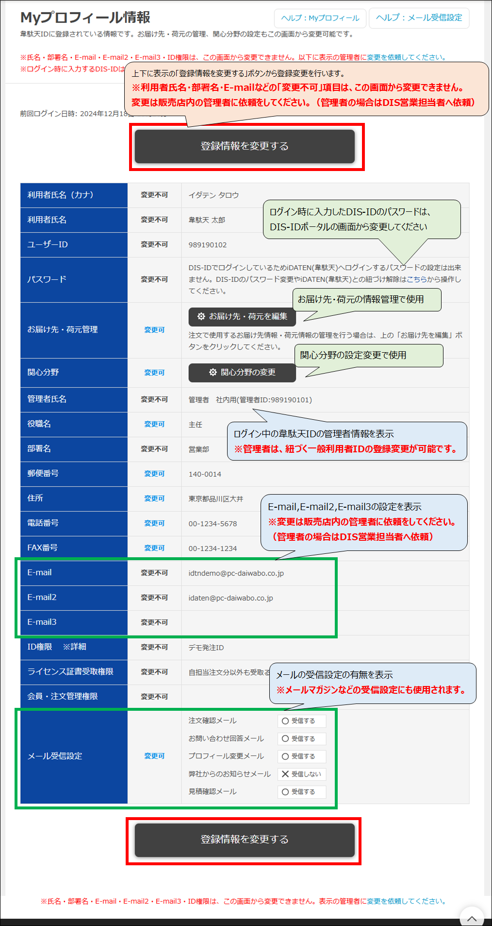 ※「利用者氏名(カナを含む)」「管理者氏名」「部署名」「E-mail・E-mail2・E-mail3」「ID権限」については、この画面から登録変更できません。