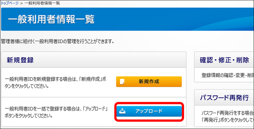 一般利用者の一括登録・修正のアップロード方法について