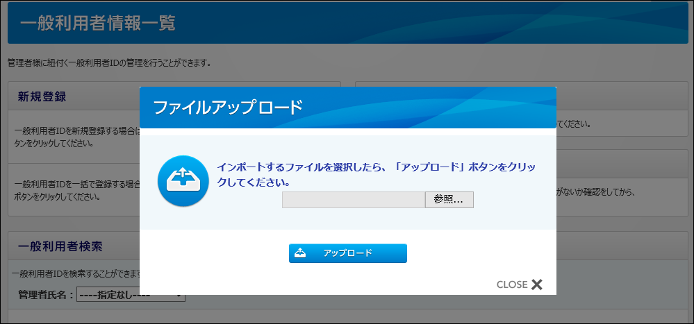 一般利用者IDを登録する場合は、1名ずつ個別登録するほかに、ファイルデータをインポートして一括登録する事もできます。