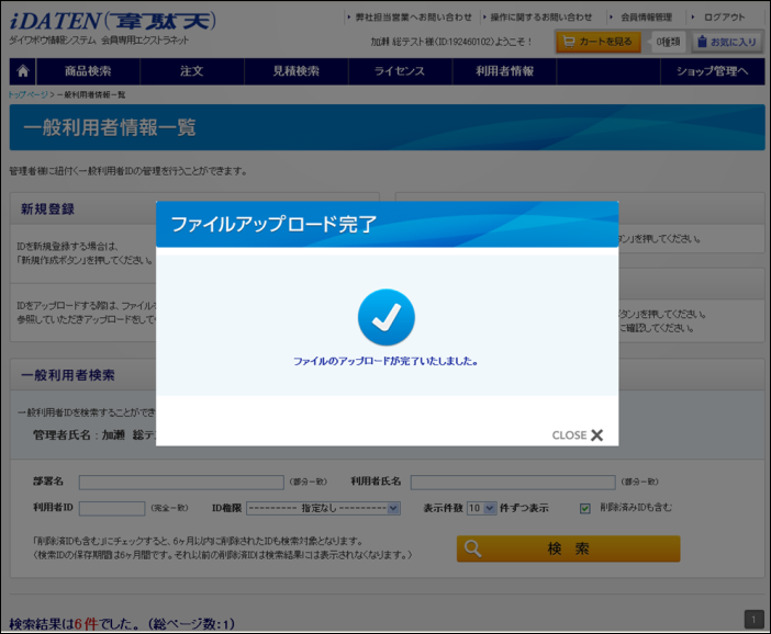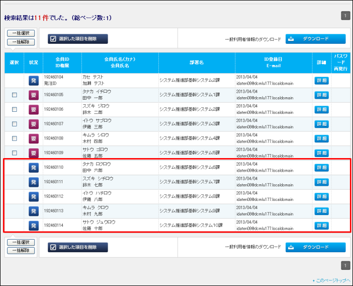 アップロードで一括登録がしたIDが、検索結果として下部の一覧に表示されます。