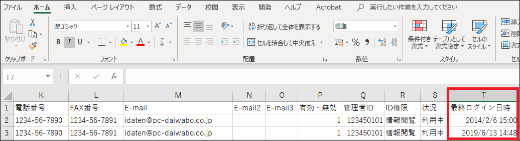 ダウンロードした登録データの「最終ログイン日時」の列を削除して、インポートファイルとしてご利用ください。