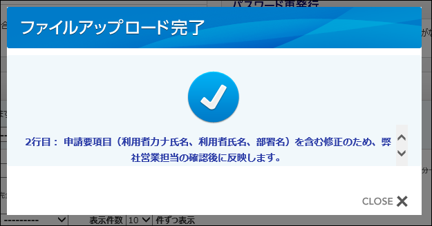 ワーニング表示のケースとして、一括修正時に「利用者カナ氏名、利用者氏名、部署名」のいずれかに修正があった場合には、弊社営業担当へメールが送られます(その場合には、営業担当が修正内容を確認した後に修正が反映されます)