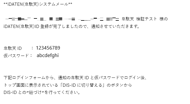 1. 登録メールアドレス宛に、韋駄天ID(数字9桁)と仮パスワードが記載されたシステムメールが送信されます。