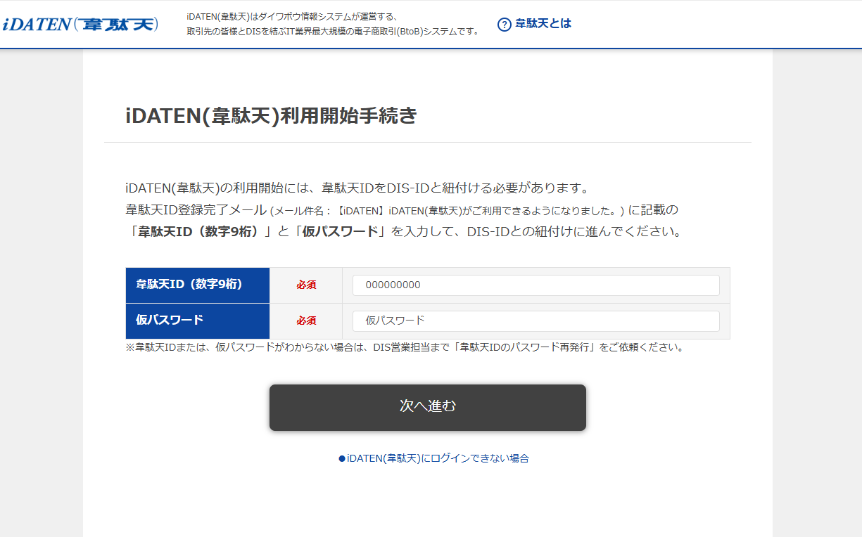 2. メールに記載されたログインフォームより、韋駄天IDと仮パスワードを入力して次へ進むをクリックしてください。