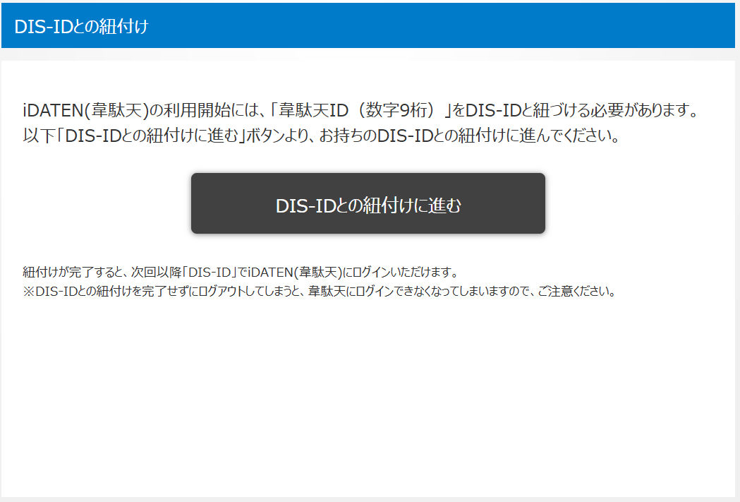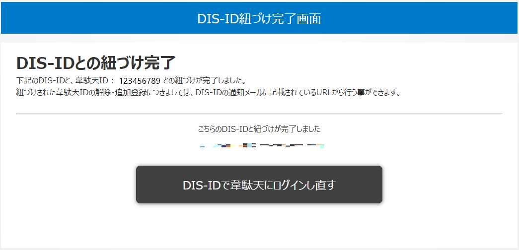 DIS-IDでログインが完了すると、新規発行された韋駄天IDと、ログインしたDIS-IDの紐付けが完了します。