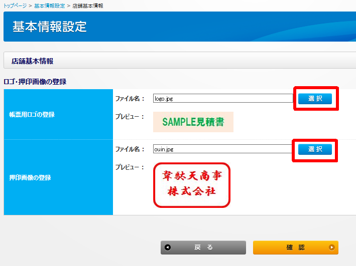 4・「帳票用ロゴの登録」または「押印画像の登録」の「選択」ボタンをクリックします。
