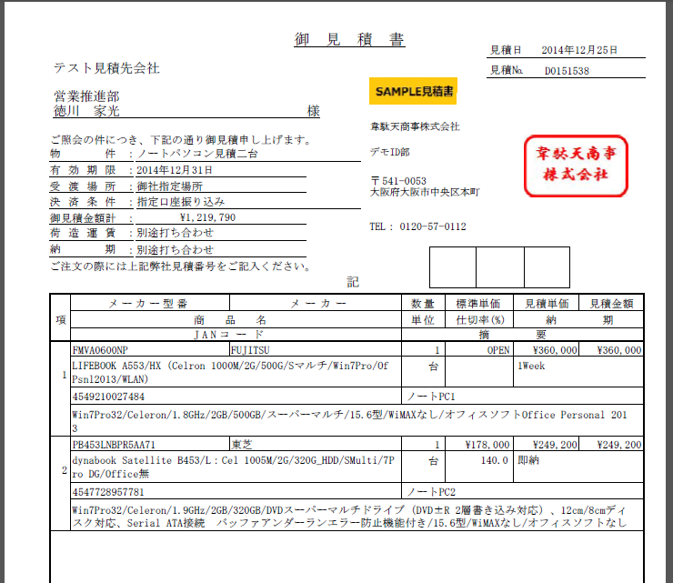 画像登録を行うと、お客様用見積書に、販売店独自の帳票用ロゴと押印画像を表示することができます。