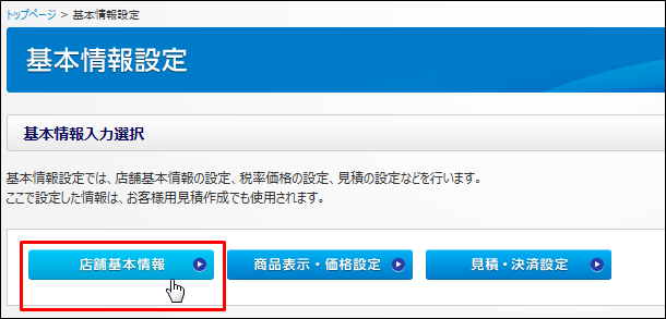 2・基本情報設定の画面が表示されるので、「店舗基本情報」ボタンをクリックします。