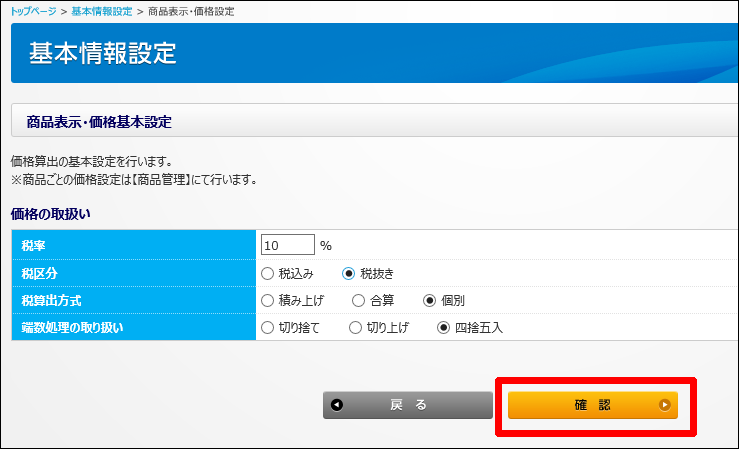 3・御社の運用にあわせて、価格の取扱いより消費税の設定を行ってください。