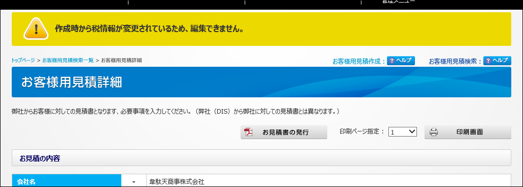 お客様用見積詳細画面で「作成時から税情報が変更されているため、編集できません」と表示されて閲覧のみに制限されます。