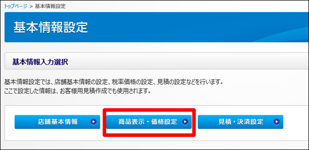 2・「商品表示・価格設定」のボタンをクリックします。