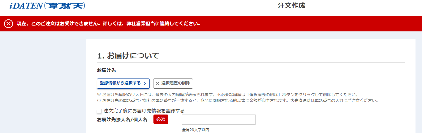 このメッセージが表示されて注文ができない場合は、弊社営業担当者に連絡のうえ、FAXなどで注文していただくようにお願いします。