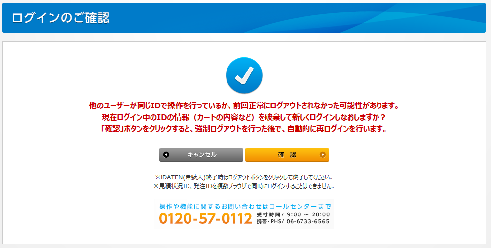 見積状況ID、発注ID、仮発注IDでは、同時に見積作成や注文作成をすることにより発生する不整合を防ぐために、同時にログインをする事はできないようになっています。