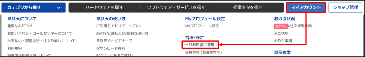 1・画面上部の「マイアカウント」の「管理・設定」より「一般利用者ID管理」を選択します。