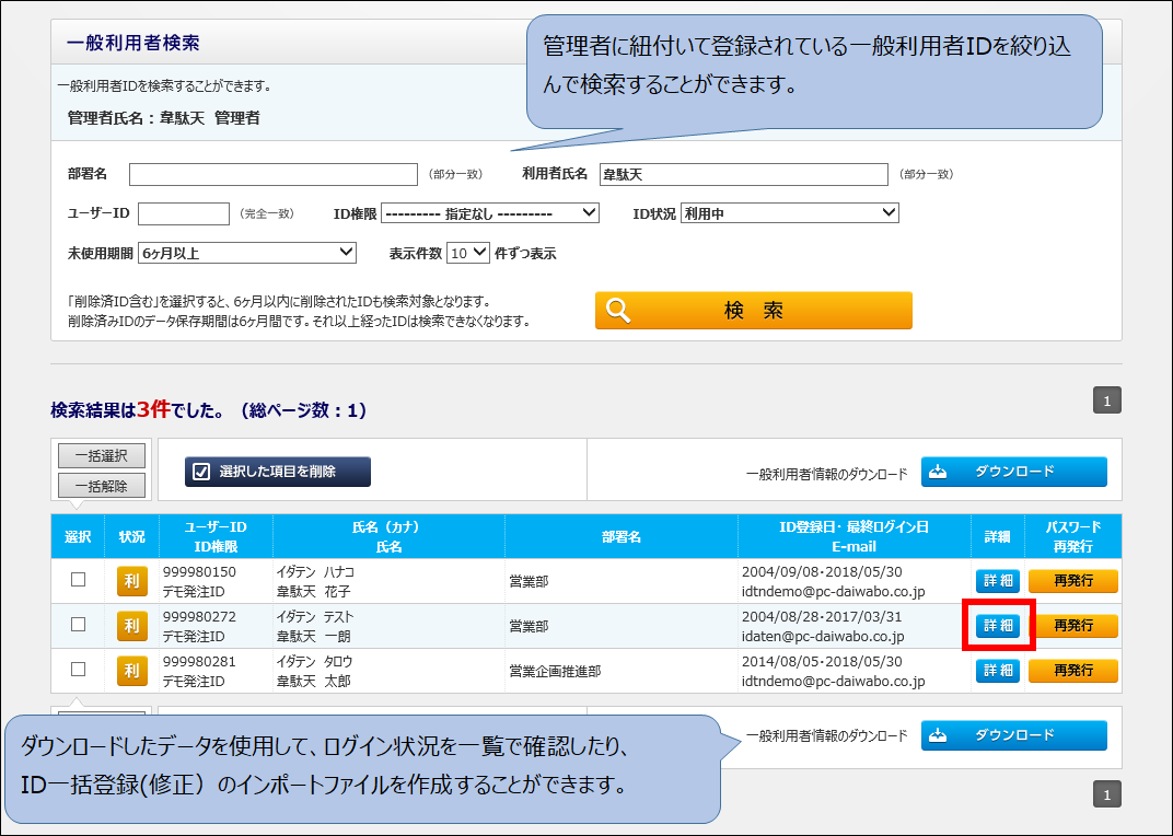 管理者IDでログインすると、管理者に紐付く一般利用者IDの登録情報を変更したり、IDを削除、利用者一覧をダウンロードすることが可能です。