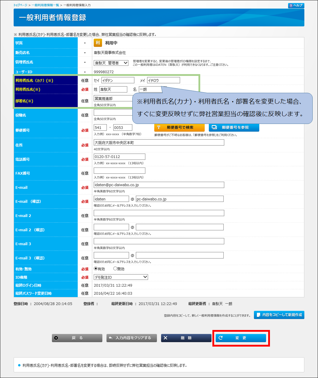 各項目の変更は、この画面から行います。入力変更したら画面下部の「変更」ボタンをクリックします。