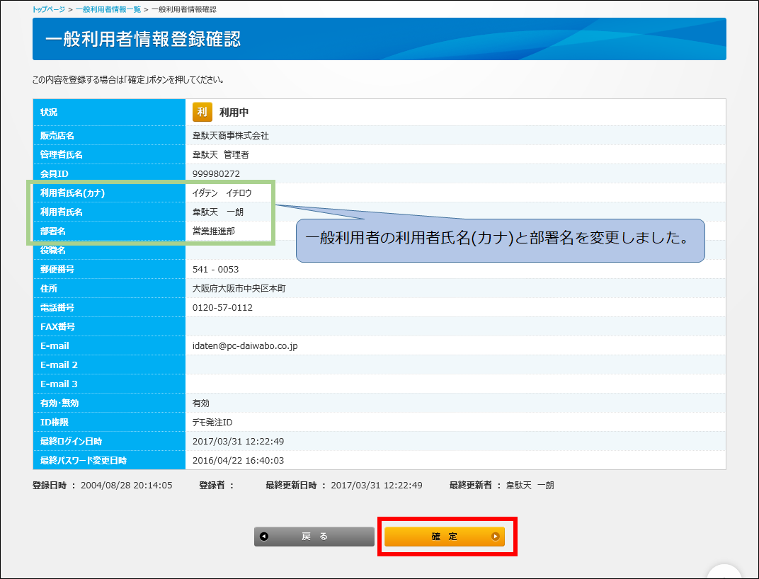※「利用者氏名(カナ)」「利用者氏名」「部署名」の項目を変更した場合は、弊社営業担当者の確認後に変更が反映することの案内が表示されます。