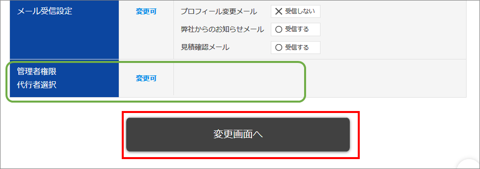 2・管理者が複数登録されている場合は、Myプロフィール情報画面の下部に「管理者権限代行者選択」が表示されます。